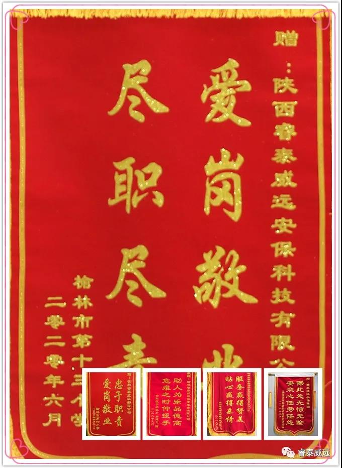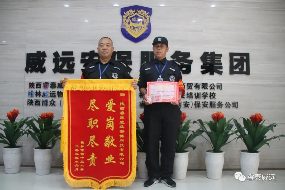 2020年6月9日上午,榆林市第十三小學(xué)校方領(lǐng)導(dǎo)親自將一面繡著“愛(ài)崗敬業(yè) 盡職盡責(zé)”贊語(yǔ)的錦旗贈(zèng)送于陜西睿泰威遠(yuǎn)安??萍加邢薰?,對(duì)該駐點(diǎn)派遣的保安員高度的責(zé)任心、盡忠職守的工作態(tài)度給予了贊揚(yáng),以薛軍和同志為學(xué)習(xí)榜樣,并對(duì)保安員們?cè)谝咔槠陂g對(duì)保衛(wèi)學(xué)校安全,維護(hù)學(xué)校秩序做出的貢獻(xiàn)表示感謝。 在與榆林市第十三小學(xué)校方領(lǐng)導(dǎo)交流過(guò)程中,他們表示保安隊(duì)員們責(zé)任心強(qiáng),以薛軍和同志為代表的保安員們?cè)诜?wù)過(guò)程中認(rèn)真細(xì)致,使校方格外放心,為學(xué)校相關(guān)工作的順利開(kāi)展做出了應(yīng)有的貢獻(xiàn);在此代表校方向威遠(yuǎn)公司派駐的所有保安隊(duì)員表示衷心的感謝! 公司運(yùn)營(yíng)總監(jiān)康毅表示將一如既往的開(kāi)展好城區(qū)各學(xué)校的安保工作,人防部經(jīng)理劉元利表示將加大管理力度,提高隊(duì)員綜合素質(zhì),更好的服務(wù)各客戶(hù)單位。