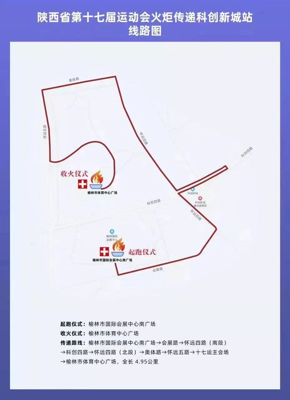 火炬?zhèn)鬟f路線從榆林市國際會(huì)展中心南廣場——榆林市體育中心廣場,沿線全長4.95公里。