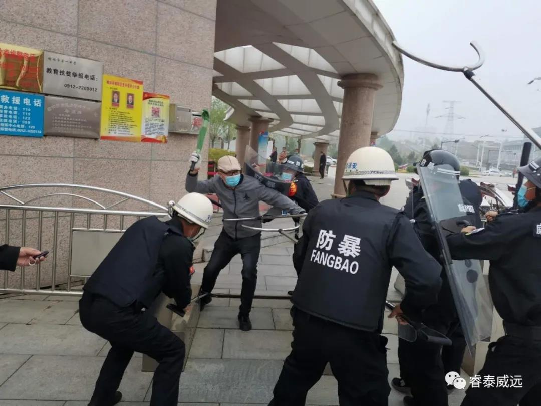 為提升公司駐城區(qū)各學(xué)校項(xiàng)目保安人員對(duì)暴力恐怖事件的應(yīng)急處置能力,維護(hù)平穩(wěn)的教學(xué)秩序、保障教學(xué)工作的正常開展、保護(hù)師生的人身財(cái)產(chǎn)安全,堅(jiān)持“安全第一、預(yù)防為主”的工作方針,5月13日公司駐榆林市第一中學(xué)分隊(duì)保安人員有序組織開展反恐防暴演練?,F(xiàn)場(chǎng),一中隊(duì)中隊(duì)長(zhǎng)趙玉忠向保安員仔細(xì)講解了反恐防暴用具的正確使用方法,以及如何在與“歹徒”對(duì)抗的過(guò)程中做好自我防范以及制服“歹徒”。 演練進(jìn)行時(shí)……